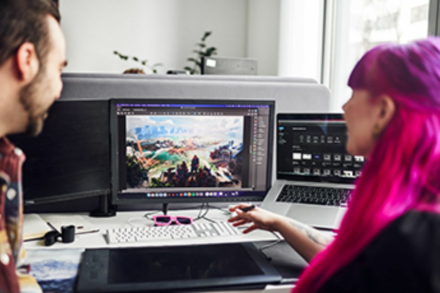 - Modernes Arbeitsumfeld (z. B. höhenverstellbarer Schreibtisch,2 Bildschirme, Laptop)