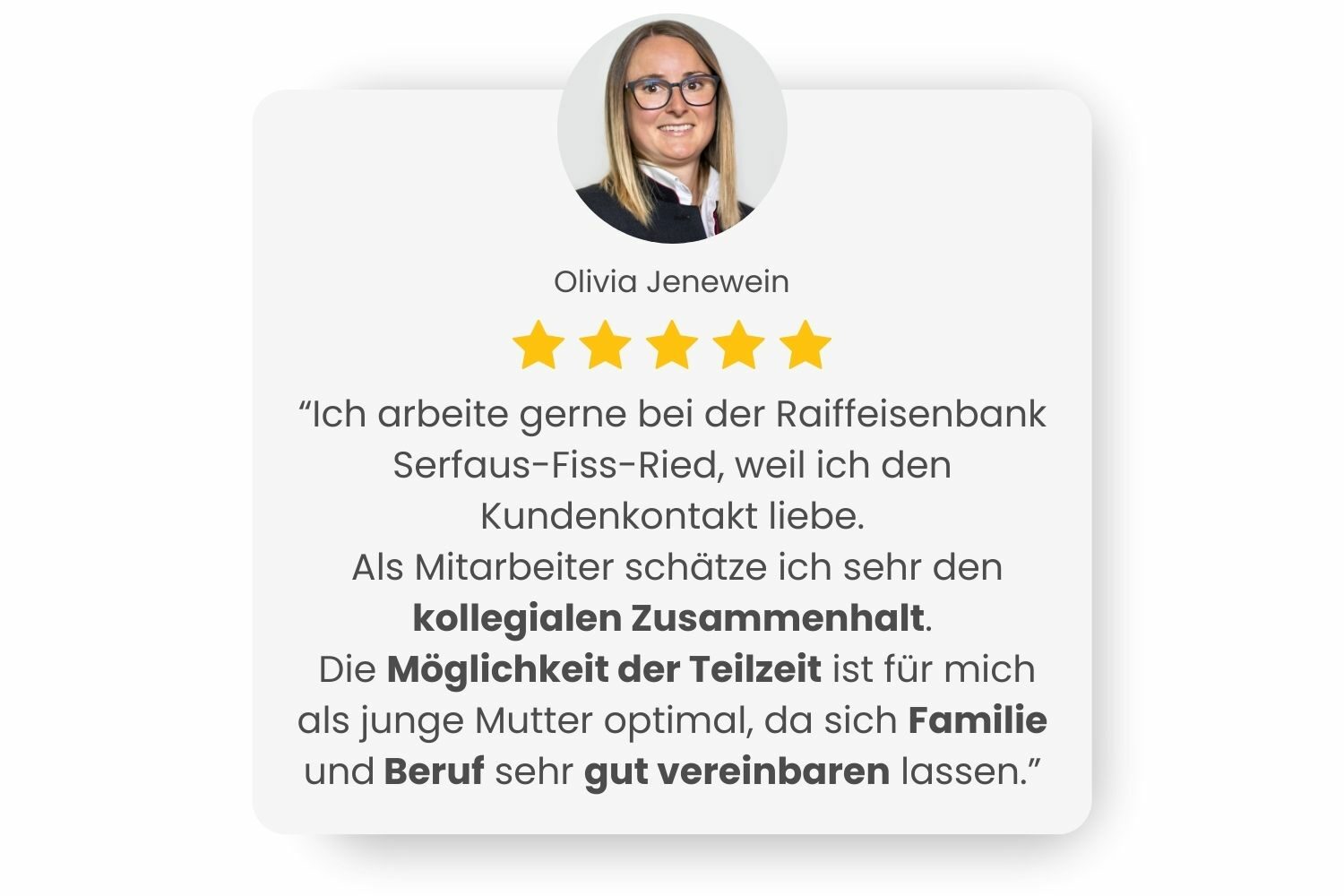 Die Raiffeisenbank Serfaus-Fiss-Ried-Nauders bietet dir als lokaler Arbeitgeber interessante Möglichkeiten, dich beruflich ganz nun zu orientieren oder in ein interessantes Berufsleben einzusteigen.